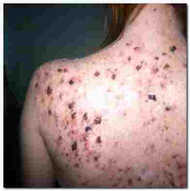 This condition presents with blackheads appearing about the face, neck, chest, upper arms and buttocks in groups of two or three. The pimples form around the blackheads. They are huge and engorged with fluid, and may possibly be sensitive to touch. They remain for a while and continue to grow and fill with pus until they lastly rupture. Following the lesion has drained, it fills up once again. After they rupture, numerous nodules can fuse together to form bigger shapes. The lesions stay for a lengthy time. They form a scab within the center but they continue to spread outwards. When the lesions do ultimately heal, they leave scars which can be the usual type of acne scar (atrophic) or is often the raised bump typically left behind by a burn or a cut (keloidal).